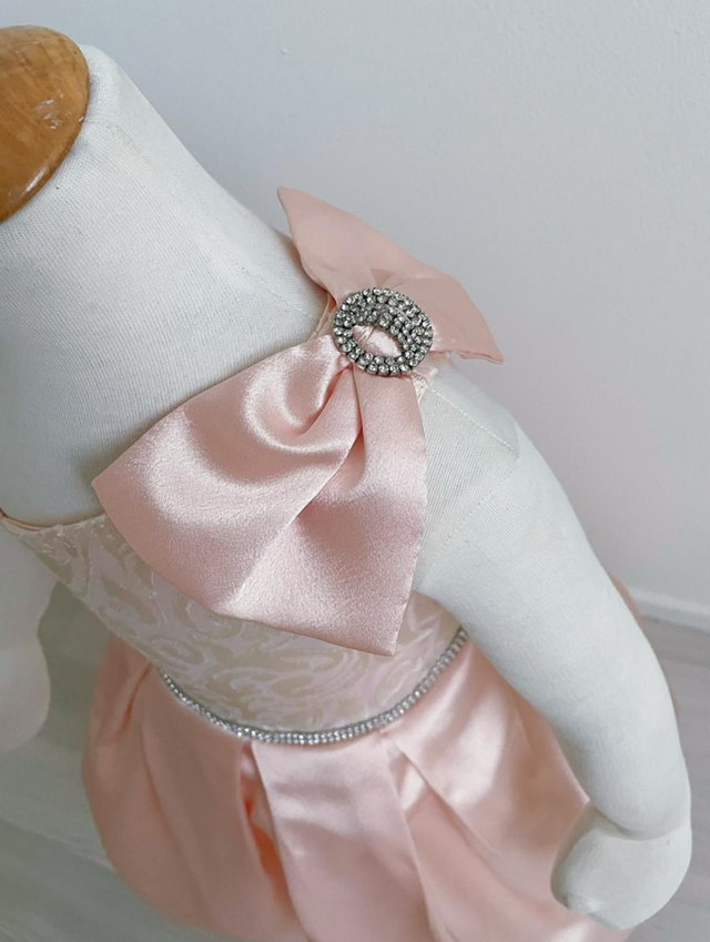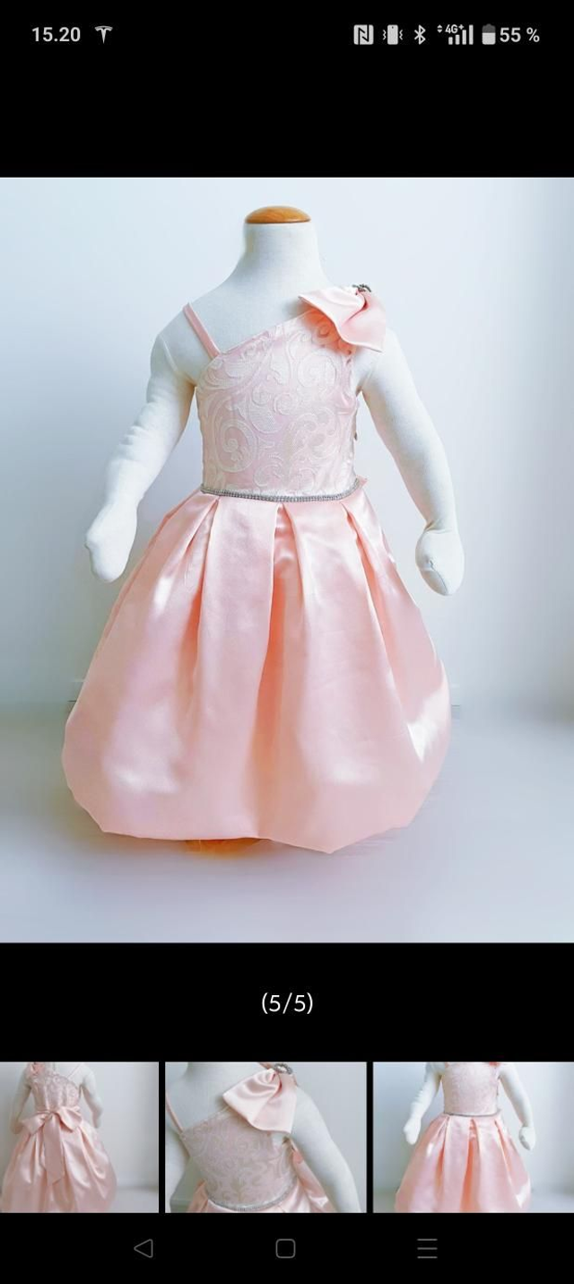 Todella kaunis satiini mekko. Kaunis rusetti olkapäällä ,missä on strassi yksityiskohta. Takana solmittavat nauhat. Koko 98-110 cm